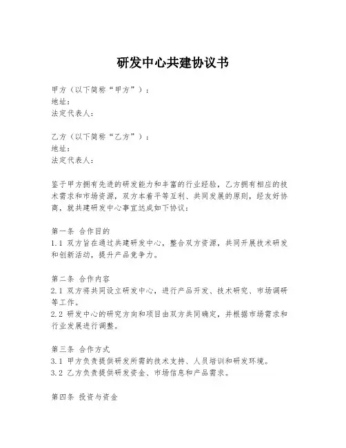 研发中心共建协议书甲方(以下简称“甲方”):地址:法定代表人:乙方(以下简称“乙方”):地址:法定代表人:鉴于甲方拥有先进的研发能力和丰富的行业经验,乙方拥有相应的技术需求和市场资源,双方本着平等互利、共同发展的原则,经友好协商,就共建研发中心事宜达成如下协议:第一条合作目的1.1 双方旨在通过共建研发中心,整合双方资源,共同开展技术研发和创新活动,提升产品竞争力。