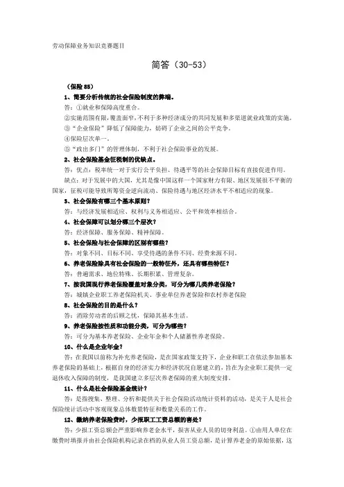 劳动保障业务知识竞赛题目简答(30-53)(保险85)1、简要分析传统的社会保险制度的弊端。