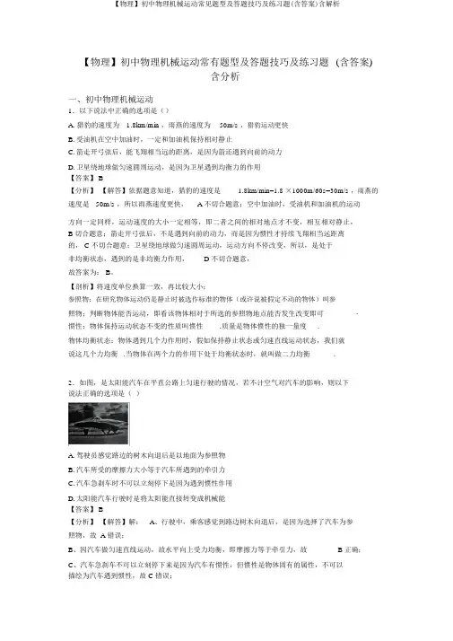 【物理】初中物理机械运动常有题型及答题技巧及练习题(含答案)含分析一、初中物理机械运动1.以下说法中正确的选项是()A. 猎豹的速度为 1.8km/min ,雨燕的速度为50m/s ,猎豹运动更快B.受油机在空中加油时,一定和加油机保持相对静止C.箭走开弓弦后,能飞翔相当远的距离,是因为箭还遇到向前的动力D.卫星绕地球做匀速圆周运动,是因为卫星遇到均衡力的作用【答案】 B【分析】【解答】依据题意知道,猎豹的速度是 1.8km/min=1.8 ×1000m/60s=30m/s ,雨燕的速度是50m/s ,所以雨燕速度更快, A 不切合题意;空中加油时,受油机和加油机的运动方向一定同样,运动速度的大小一定相等,即二者之间的相对地点才不变,相互相对静止,B 切合题意;箭走开弓弦后,不是遇到向前的动力,而是因为惯性才持续飞翔相当远距离的, C 不切合题意;卫星绕地球做匀速圆周运动,运动方向不停改变,所以,是处于非均衡状态,遇到的是非均衡力作用, D 不切合题意,故答案为: B。