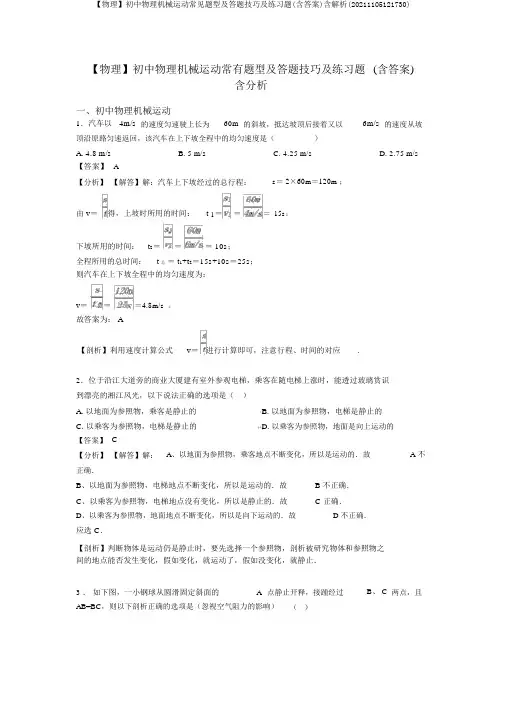 【物理】初中物理机械运动常有题型及答题技巧及练习题(含答案)含分析一、初中物理机械运动1.汽车以4m/s的速度匀速驶上长为60m的斜坡,抵达坡顶后接着又以6m/s的速度从坡顶沿原路匀速返回,该汽车在上下坡全程中的均匀速度是()A. 4.8 m/sB. 5 m/sC. 4.25 m/sD. 2.75 m/s 【答案】A【分析】【解答】解:汽车上下坡经过的总行程:s= 2×60m=120m ;由 v=得,上坡时所用的时间:t 1===15s;下坡所用的时间:t2=== 10s;全程所用的总时间:t 总= t1+t2=15s+10s=25s;则汽车在上下坡全程中的均匀速度为:v===4.8m/s。