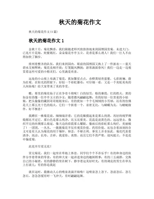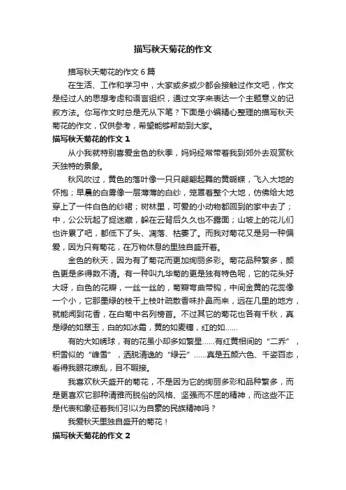 描写秋天菊花的作文描写秋天菊花的作文6篇在生活、工作和学习中,大家或多或少都会接触过作文吧,作文是经过人的思想考虑和语言组织,通过文字来表达一个主题意义的记叙方法。