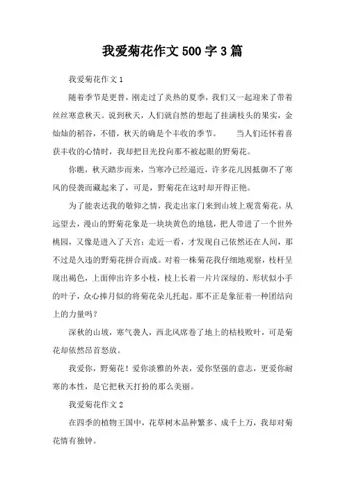 篇二:我爱菊花在我们班里,同学们各自喜欢不同的花,有人喜欢兰花,有人喜欢梅花,而我最钟爱的是菊花。