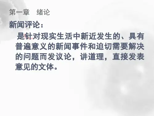 新闻评论被称作是“报纸的心脏”,而短评 则被称作是新闻评论中的“轻骑兵”,它是 一种篇幅短小、内容集中、简明扼要的新闻 评论文章。其特点是形式短小精悍、内容鲜 明独到、语言生动活泼。