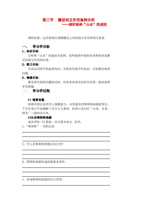 第三节圈层相互作用案例分析——剖析桂林山水的成因一、教学目标1、知识与技能:以桂林“山水”的成因为案例,说明地理环境的形成和演变是圈层间相互作用的结果,加深理解地理环境的整体性。