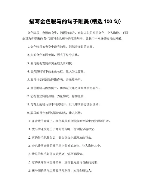 以下是我精心创作的70句描写骏马奔驰的唯美句子:1. 奔驰的骏马如飞一般,回荡着自由的呼唤。