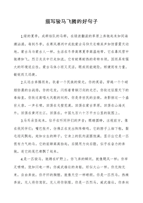 那强劲的铁蹄,仿佛响着"嗒嗒"的蹄声6、无边无际的草原上有矫健的骏马,在自由的奔跑,他们飞快地奔跑,就像脱缰的马儿,如同离弦之箭一般飞奔而去,像风一样在草原上来回奔跑,像闪电一样在草原上来回穿梭。