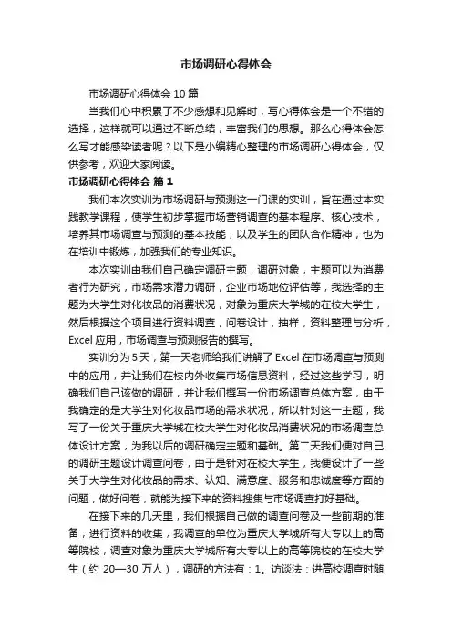 市场调研心得体会篇1我们本次实训为市场调研与预测这一门课的实训,旨在通过本实践教学课程,使学生初步掌握市场营销调查的基本程序、核心技术,培养其市场调查与预测的基本技能,以及学生的团队合作精神,也为在培训中锻炼,加强我们的专业知识。