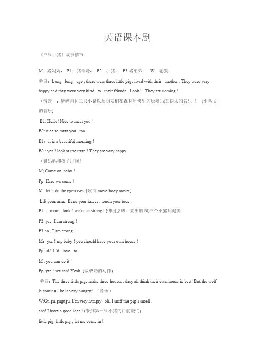 英语课本剧《三只小猪》故事情节:M:猪妈妈,P1:猪哥哥,P2:小猪,P3猪弟弟,W:老狼旁白:Long long ago , there were three little pigs lived with their mother . They were very happy and they were very kind to their friends . Look ! They are coming !(情景一:猪妈妈和三只小猪以及朋友们在森林里快乐的玩耍)(加快乐的音乐) (小鸟飞的音乐)B1: Hello! Nice to meet you !B2: nice to meet you , too.B1:it is a beautiful morning !B2 : yes ! look at the trees ! They are very happy!(猪妈妈和孩子出现)M; Come on ,baby !Pp: Here we come !M : let’s do the exercises. (歌曲move body move )Lift your arms. Bend your knees . touch your toes .P1 :mom , look ! we’re so strong ! (伸出胳膊,亮出肌肉)三个小猪比健美P2 :yes ,I am strong !P3:no , I am strong !M:yes ! my baby ! you should have your own house !Pp: ok! I ’d love to .M : you can do it !Pp :yes ! we can! Yeah! (做成功的动作)旁白:The three little pigs make three houses . they all think their own house is best! But the wolf is coming ! he is very hungry! (音乐)W:Gu,gu,gugugu. I’m very hungry . oh, I sniff the pig’s smell .aha! I have a good idea ! (来到第一只小猪的门前敲们)little pig, little pig , let me come in !P1: No ! you are bad wolf !W :then I ’ll huff and I ’ll huff ,and I ’ll blow your house in .(吹一下,房子倒了,小猪突然发现,吓了一下,逃跑)P1:Oh !help !help! my brother ! please help me !(迅速进入第二只小猪家,然后马上关门)P1: open the door ! (堵着门)P2:Don’t be afraid !W: little pig ,little pig , let me come in !P1: no ! no !W: then I ’ll puff , blow your house!(狼鼓足气吹一下,房子有点摇晃,又吹三下,两只小猪堵着门,挣扎之后,房子倒了)(挣扎快跑)p1p2:oh , my god !let’s run away ,run away !(跑到第三个小猪家的床底下哆嗦)P1:the wolf is very strong !P2: he wants to eat us !P3:my god , help me ! ( 三只小猪都在床底下)W: little pig ,little pig , let me come in !P1P2P3:no !W : open the door! I can get the house down !(吹三下,没动,鼓足又吹三下,迟疑了一下)why ?(最后吹三下,开始喘气了,然后倒地)p1p3p2 : yeah ! we are safe ! (歌曲幸福歌)旁白:the wolf is very angry ! he has a good idea ! he climbs the chimney ! the bird tells the three little pigs !B1B2 :my friends !look at the chimney ! (狼爬上了烟囱)P1: how to do ? (开始转着跑)P2 :MOM !where are you ? (哭着说)P3:don’t worry ! let’s p ut the wood into the fire !P1p2p3: ok , ,123…W : (掉进火里挣扎) help ! no !P1p2p3: the wolf is dying ! we are succeed !yeah !。