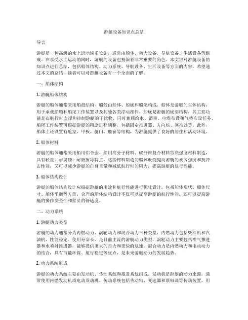 游艇设备知识点总结导言游艇是一种高级的水上运动娱乐设施,通常由船体、动力设备、导航设备、生活设备等组成。