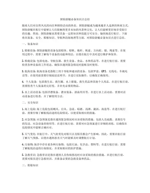 一、装备知识1. 船舶设备: 探险游艇的设备包括船体、船帆、桅杆、帆索、方向舵、锚、绳索等。