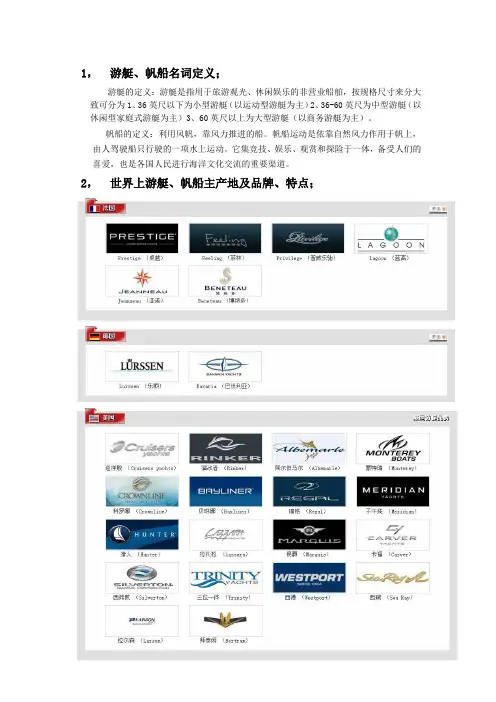 2,世界上游艇、帆船主产地及品牌、特点;•3, 国内游艇、帆船主要品牌、特点,前20位; 中国 ••太阳鸟(Sunbird)特点:国内第一品牌,上市公司,年产值较高,游艇产品较完••海星(Heysea)杰腾(JETTERN)美国•Regal (瑞格)(特点:低、中、高端游艇产品都有,适合各类人群,在中国的游艇占用率较高)•••Sea Ray (西瑞)(特点:低、中、高端游艇产品都有,适合各类人群,在中国的游艇占用率较高)•Bertram (拜泰姆)意大利•••(特点:流线型、高速的船体设计,理念与意大利车一样新颖)•Riva (丽娃)英国•Sunseeker (圣斯克)(特点:游艇制造商,以高端产品为主)•Princess (公主)(特点:游艇制造商,以高端产品为主)法国••Jeanneau (亚诺)(特点:以帆船为主打产品)•Beneteau (博纳多)(特点:以帆船为主打产品,中国杯帆船赛30条统一级别的40.7就是这个品牌,在国内的帆船占有率较高)德国•Bavaria (巴伐利亚)澳大利亚•4,国内帆船赛事及特点;1、中国杯帆船赛中国杯帆船赛中国杯帆船赛首个由中国人创办的大帆船国际赛事。