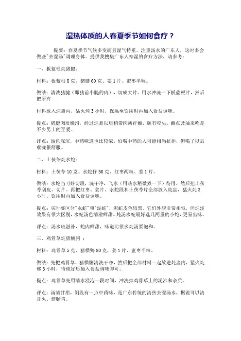 提供我搜集广东人祛湿的食疗方法,请参考:一、板蓝根炖猪腱:材料:板蓝根8克、猪腱60克、姜1片、蜜枣半粒。