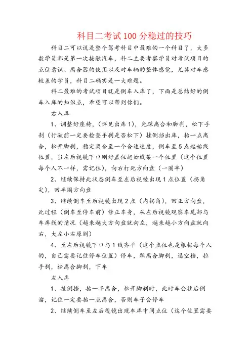 科目二考试必过绝招科目二考试必过绝招一、倒车入库倒库出库并不难,系带挂挡左灯闪,踩住离合放手刹,慢抬离合起步缓。