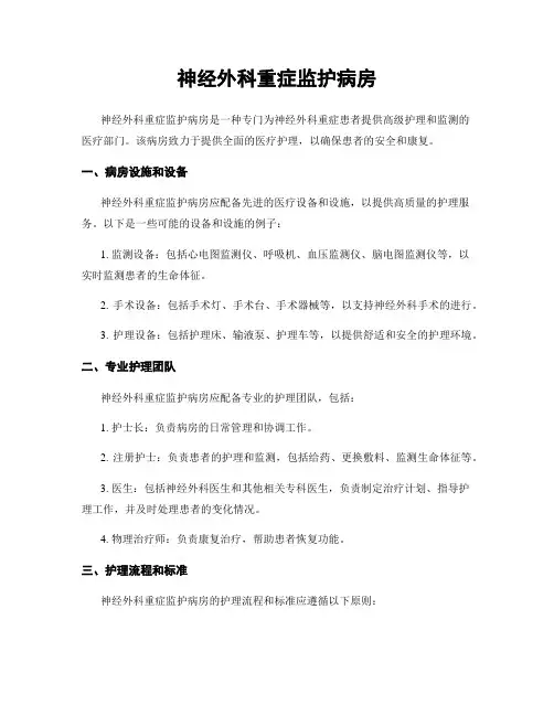 二、专业护理团队神经外科重症监护病房应配备专业的护理团队,包括:1. 护士长:负责病房的日常管理和协调工作。