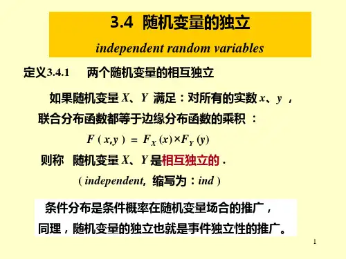 定义3.9 设n维随机变量(X1,X2,…,Xn)的分 布函数为F(x1,x2,…,xn),FXi (xi)为Xi的边缘分布 函数,如果对任意n个实数x1,x2,…,xn,有