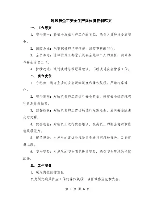 通风防尘工安全生产岗位责任制范文(二)一、安全生产岗位责任制的原则1. 安全第一原则:把保障员工生命安全和身体健康放在首位。