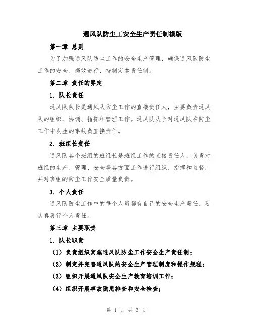 第一章通风防尘工安全生产责任制总则一、为了保障工人的健康与安全,确保通风防尘工作的质量和效果,制定本责任制。