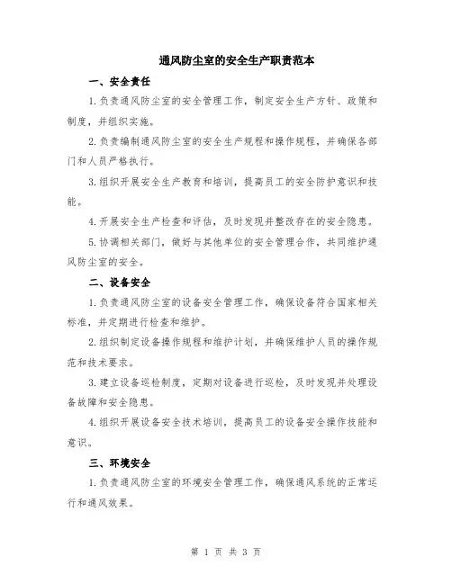 通风防尘室的安全生产职责范本一、安全责任1.负责通风防尘室的安全管理工作,制定安全生产方针、政策和制度,并组织实施。