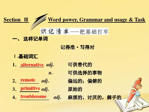 Theplantsdiedbecauseof lackofwater.vt.缺乏lacksth.belackingin3)虽然缺钱,他⽗母亲还是设法让他上了⼤学. Thoughlackingmoney,theirparentsmanagedtosendhimtocollege.4)由于缺少充⾜的睡眠,⼤多数学⽣感到很累.Lackingenoughsleep,themajorityofstudentsfeeltired.5)他真正的问题是他缺乏⾃信.Hisrealproblemisthathelacksconfidence.6)moreandmorehigh-risebuildingshavebeenbuiltinbigciti es_c____space.A.insearchofB.inplaceofc.forlackofD.forfearof3.…asitismoreoftenreferredto.referto谈及,提及,涉及,参考,查阅)Don'trefertothismatteragain,please.谈及2)ThesebooksrefertoAsianproblems.涉及3)Theseregulationsreferonlytochildren.与…有关4)Ifyouwanttoknowhistelephonenumber,youmayrefertoth etelephonedirectory.查阅refer…to…还表⽰“把…提交给/委托给…;把…归功于…”之意5)Tomisgoingtoreferthemattertothemeeting.6)Hereferredhissuccesstothegoodeducationhehadhad.7)Itwasfoolishofhimto__A___hisnotesduringthatimport anttest,andasaresult,hegotpunished.A.sticktoB.refertoc.keeptoD.pointto8).onceadecisionhasbeenmade,allofusshould__B___it.A.directtoB.sticktoc.leadtoD.referto4Asyouknow,theUNtouchesthelivesofpeopleeverywhere.touchvt.触摸,接触;涉及;感动,打动;吃,喝;⽐得上)Sheiscuriousabouteverythingandwantstotouchthem.接触2)you’vhardlytouchyourfood.吃3)whathesaidreallytouchedmyheart.触动,感动4)Noonecantouchhimwhenitcomestothedesign.⽐得上5)Theseareissuesthattouchuaall.涉及6)Thefilmisvery touchingandwearealltouchedbythereunionofthefatheran dhiason. touchn.getintouchwith…与…取得联系keepintouchwith…与…保持联系losetouchwith…与…失去联系bein/outoftouch有/没有联系5equaladj.相等的,平等的,胜任的beequalto等于,⽐得上equalsth./doingsth.)妇⼥们要求同⼯同酬。