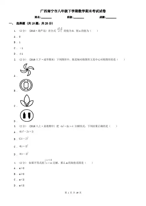 广西南宁市八年级下学期数学期末考试试卷姓名:________ 班级:________ 成绩:________一、选择题 (共10题;共20分)1. (2分)(2018·葫芦岛) 若分式的值为0,则x的值为()A . 0B . 1C . ﹣1D . ±12. (2分) (2019八下·成华期末) 下列图形中,既是轴对称图形又是中心对称图形的是()A .B .C .D .3. (2分) (2019八上·泉港期中) 把分解因式,下列结果正确的是()A .B .C .D .4. (2分)如果不等式组无解,那么m的取值范围是()A . m>8B . m≥8C . m<8D . m≤85. (2分) (2020八上·温州期中) 对于命题“如果∠1 + ∠2 = 90°,那么∠1≠∠2”,能说明它属于假命题的反例是()A . ∠1 = 50°,∠2 = 40°B . ∠1 = 50°,∠2 = 50°C . ∠1 = ∠2 = 45°D . ∠1 = 40°,∠2 = 40°6. (2分) (2019八下·埇桥期末) 如图,四边形中,,,,点,分别为线段,上的动点(含端点,但点不与点重合),点,分别为,的中点,则长度的最大值为A . 8B . 6C . 4D . 57. (2分)已知∠a=30°,则∠a的余角是()A . 150°B . 30°C . 90°D . 60°8. (2分)如图,直线y=kx+b经过A(2,1),B(﹣1,﹣2)两点,则不等式x>kx+b>﹣2的解集为()A . x<2B . x>﹣1C . x<1或x>2D . ﹣1<x<29. (2分)如图,在△ABC中,∠A=36°,∠C=72°,∠ABC的平分线交AC于点D,则图中共有等腰三角形()A . 0个B . 1个C . 2个D . 3个10. (2分)不等式﹣3x+6>0的正整数解有()A . 1个B . 2个C . 3个D . 无数多个二、填空题 (共4题;共8分)11. (5分)(2018·井研模拟) 分解因式: =________12. (1分) (2019八上·麻城期中) 已知P1 , P2关于x轴对称P2 , P3关于y轴对称,P3(﹣3,4),则P1的坐标为________.13. (1分)已知关于x的方程(a+1)x=2ax﹣a2的解是负数,那么a的取值范围是________.14. (1分) (2019八上·哈尔滨月考) 如图,已知△ABC和△ADE都是正三角形,连接CE、BD、AF,BF=4,CF=7,求AF的长________ .三、解答题 (共11题;共72分)15. (4分)解分式方程=1-.16. (5分)(2020·三明模拟) 解不等式组并把它的解集表示在数轴上.17. (5分) (2019八上·海珠期末) 如图,已知△ABC中AB=AC ,在AC上有一点D ,连接BD ,并延长至点E ,使AE=AB .(1)画图:作∠EAC的平分线AF , AF交DE于点F(用尺规作图,保留作图痕迹,不写作法);(2)在(1)的条件下,连接CF ,求证:∠ABE=∠ACF;(3)若AC=8,∠E=15°,求三角形ABE的面积.18. (5分) (2019八上·获嘉月考) 已知:如图,在△ABC中,∠BAC=90° ,AD⊥BC于D,AE平分∠DAC,∠B=50° ,求∠AEC的度数.19. (5分)计算10边形的内角和及外角和.20. (5分)先化简,再求值:÷(x﹣1﹣),其中x是方程x2+x﹣6=0的根.21. (5分) (2020八下·兰州期末) 如图,在平面直角坐标系中,已知的三个顶点坐标分别是.( 1 )将向下平移5个单位后得到,请画出;( 2 )将绕原点逆时针旋转90°后得到,请画出;22. (8分) (2020八下·延平月考) 计算:(1);(2).23. (10分) (2019八上·河西期中) 在平面直角坐标系中,点A(2,0),点B(0,3)和点C(0,2).(1)请直接写出OB的长度:OB=________;(2)如图:若点D在x轴上,且点D的坐标为(﹣3,0),求证:△AOB≌△COD.24. (10分) (2019七下·孝南期末) 某商场为做好“家电下乡”的惠民服务,决定从厂家购进甲、乙、丙三种不同型号的电视机108台,其中甲种电视机的台数是丙种的4倍,购进三种电视机的总金额不超过147 000元,已知甲、乙、丙三种型号的电视机的出厂价格分别为1 000元/台,1 500元/台,2 000元/台.(1)求该商场至少购买丙种电视机多少台?(2)若要求甲种电视机的台数不超过乙种电视机的台数,问有哪些购买方案?25. (10分) (2019八下·吴兴期末) 如图1,在△OAB中,∠OAB=90°,∠AOB=30°,OB=8,以OB为边,在△OAB外作等边△OBC,D是OB的中点,连接AD并延长交OC于E。