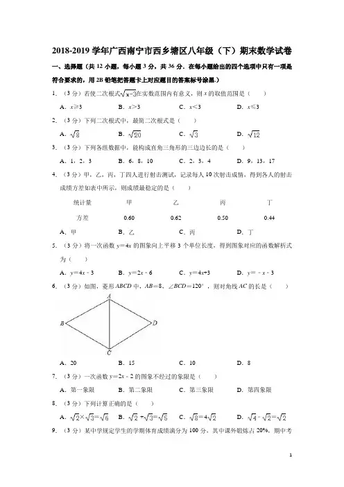 广西南宁市八年级下学期数学期末考试试卷姓名:________ 班级:________ 成绩:________一、单选题 (共8题;共16分)1. (2分)要使二次根式有意义,则x应满足()A . x≠2B . x≥-1C . x>2D . x≥2【考点】2. (2分) (2019八下·哈尔滨期中) 如图,两个正方形的面积分别是100和36,则字母B所代表的正方形的面积是()A . 8B . 10C . 64D . 136【考点】3. (2分)(2020·瑶海模拟) 校团委组织开展“医助武汉捐款”活动,小慧所在的九年级(1)班共40名同学进行了捐款,已知该班同学捐款的平均金额为10元,二小慧捐款11元,下列说法错误的是()A . 10元是该班同学捐款金额的平均水平B . 班上比小慧捐款金额多的人数可能超过20人C . 班上捐款金额的中位数一定是10元D . 班上捐款金额数据的众数不一定是10元【考点】4. (2分)下列运算错误的是()A .B .C .D .【考点】5. (2分) (2017八下·启东期中) 如图,两个大小不同的正方形在同一水平线上,小正方形从图①的位置开始,匀速向右平移,到图③的位置停止运动.如果设运动时间为x,两个正方形重叠部分的面积为y,则下列图象中,能表示y与x的函数关系的图象大致是()A .B .C .D .【考点】6. (2分) (2020八下·顺义期中) 已知一次函数y=kx+b的图象如图,则k、b的符号是()A . k>0,b>0B . k>0,b<0C . k<0,b>0D . k<0,b<0【考点】7. (2分)平行四边形的对角线长为x、y,一边长为11,则x、y的值可能是()A . 8和14B . 10和8C . 10和32D . 12和14【考点】8. (2分) (2020八下·常熟期中) 在▱ABCD中,E、F分别在BC、AD上,若想要使四边形AFCE为平行四边形,需添加一个条件,这个条件不可以是A .B .C .D .【考点】二、填空题 (共8题;共8分)9. (1分) (2018八下·昆明期末) 学校准备从甲、乙、丙、丁四个科创小组中选出一组代表学校参加青少年科技创新大赛,各组的平时成绩的平均数(单位:分)及方差s2如表所示:甲乙丙丁7887s21 1.21 1.8如果要选出一个成绩较好且状态稳定的组去参赛,那么应选的组是________.【考点】10. (1分) (2018八上·福田期中) 已知实数x,y满足 ,则的值是________【考点】11. (1分) (2020八下·和平期末) 己知一次函数,当时,函数的最大值是________.【考点】12. (1分) (2017八下·宁波期中) 如图,在菱形ABCD中,对角线AC=6,BD=8,点E、F分别是边AB、BC 的中点,点P在AC上运动,在运动过程中,存在PE+PF的最小值,则这个最小值是________【考点】13. (1分)为了解现在中学生的身体状况,某市抽取100名初三学生测量了他们的体重.在这个问题中,样本是________ .【考点】14. (1分) (2020八下·安陆期末) 如图,在平行四边形ABCD中,AB=2AD,BE平分∠ABC交CD于点E,作BF⊥AD,垂足为F,连接EF,小明得到三个结论:①∠FBC=90°;②ED=EB;③ .则三个结论中一定成立的是________.【考点】15. (1分)已知函数y1=x,y2=x2和y3=,有一个关于x的函数,不论x取何值,y的解析式总是取y1、y2、y3中的值的较小的一个,则y的最大值等于________【考点】16. (1分)半径为6cm的圆中,垂直平分半径OA的弦长为________cm.【考点】三、解答题 (共9题;共85分)17. (5分) (2020八上·英德期末) 计算:【考点】18. (5分) (2020八下·天桥期末) 如图,□ABCD的对角线AC,BD相交于点O,点E、F在BD上,且BE=DF,求证:四边形AECF是平行四边形.【考点】19. (10分) (2017八下·江海期末) 如图正比例函数y=2x的图像与一次函数的图像交于点A (m,2),一次函数的图象经过点B(-2,-1)与y轴交点为C与x轴交点为D.(1)求一次函数的解析式;(2)求的面积。