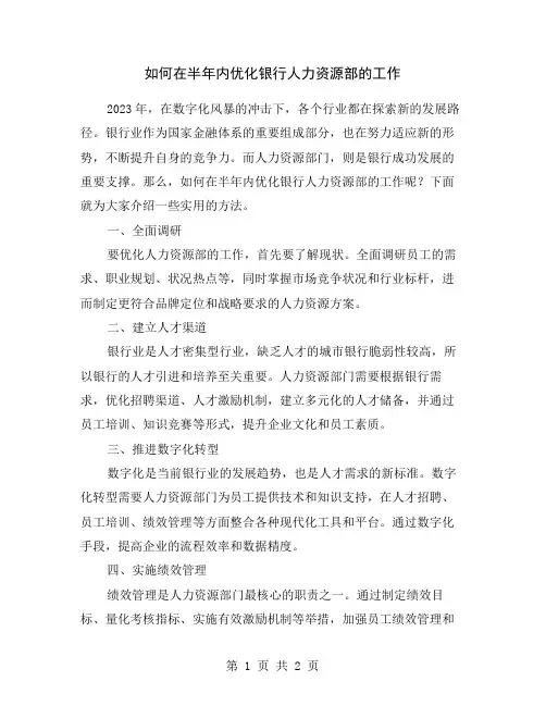 银行人力资源管理的优化与改进第一章:引言随着金融业的不断发展,人力资源管理成为了银行业发展的重要关键之一。