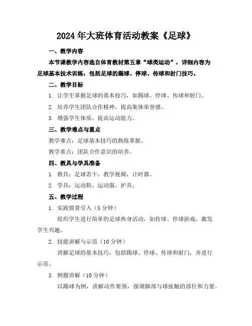 2024年足球课堂教学设计教案(5篇课时1:《足球基本技巧》一、教学内容本节课选自教材《足球》第一章,详细内容包括:足球基本技巧(停球、传球、射门)、场上的基本位置和职责。