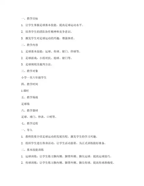 一、教学目标1. 让学生了解足球的基本知识和规则,激发学生对足球运动的兴趣。