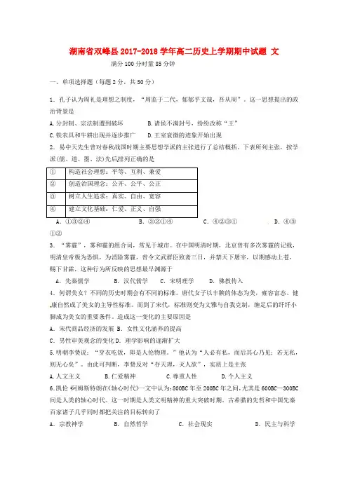 2017—2018学年度第一学期双峰一中高二历史期中试题(文科)满分100分时量85分钟一、单项选择题(每题2分,共50分)1. 孔子认为周礼是理想之制度,“周监于二代,郁郁乎文哉,吾从周”。
