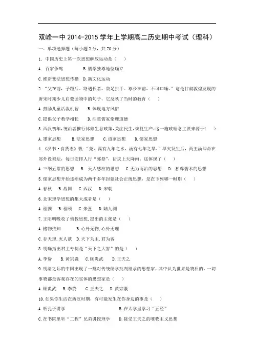 双峰一中2014-2015学年上学期高二历史期中考试(理科)一、单项选择题(每小题2分,共70分)1.中国历史上第一次思想解放运动是()A.百家争鸣 B.儒学独尊地位确立C.维新变法思想传播D.新文化运动2.“父在前,子踵后。