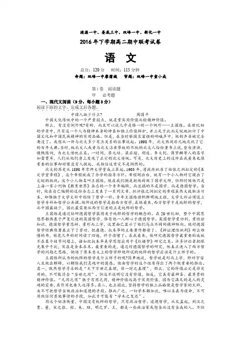 涟源一中、娄底三中、双峰一中、新化一中2016年下学期高二期中联考试卷语文总分:120分时间:115分钟命题:双峰一中廖蒲娥审题:双峰一中童小成第I卷阅读题甲必考题一、现代文阅读(9分,每小题3分)阅读下面的文字,完成文后各题。