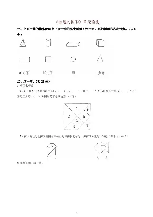 《有趣的图形》单元检测一、上面一排的物体能画出下面一排的哪个图形?连一连,再把图形和名称连起。