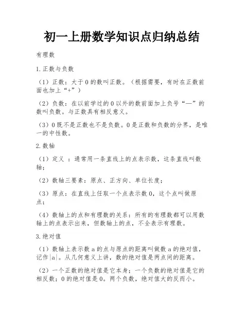 初一上册数学知识点归纳总结有理数1.正数与负数(1)正数:大于0的数叫正数。