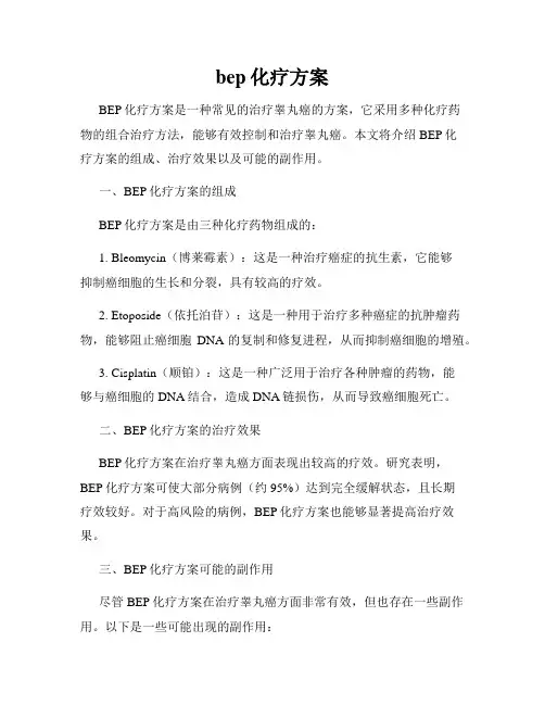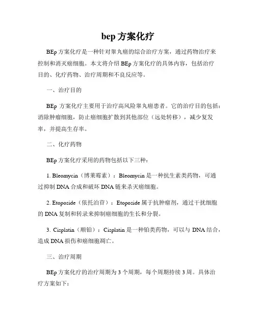 一、BEP化疗方案的组成BEP化疗方案是由三种化疗药物组成的:1. Bleomycin(博莱霉素):这是一种治疗癌症的抗生素,它能够抑制癌细胞的生长和分裂,具有较高的疗效。