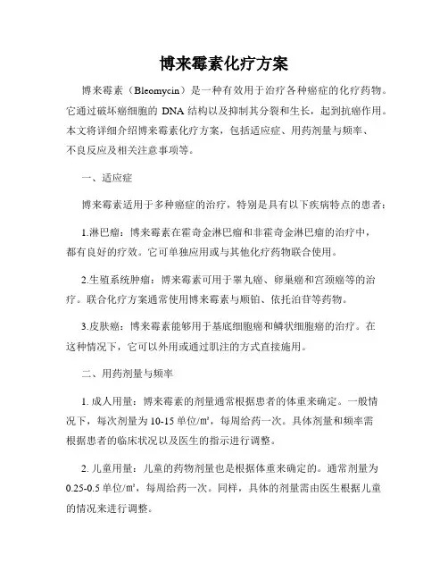 二、适应症博来霉素化疗方案主要适用于以下疾病的治疗:1. 细菌感染:博来霉素对多种革兰氏阳性菌和阴性菌具有抗菌作用,特别在耐药菌引起的感染治疗中应用广泛。