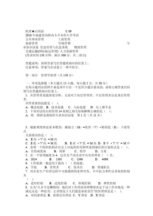 机密★启用前 C 092010年福建省高职高专升本科入学考试公共事业管理工商管理旅游管理市场营销专业知识试卷信息管理与信息系统物流管理交通运输(国际航运管理) 人力资源管理(考试时间150分钟,满分300分,共二部分)答题说明:请将答案写在答题纸相应的位置上。