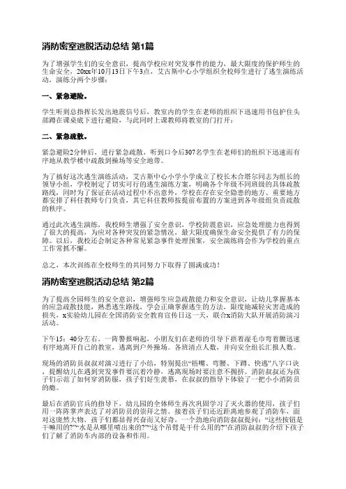 消防密室逃脱活动总结第1篇为了增强学生们的安全意识,提高学校应对突发事件的能力,最大限度的保护师生的生命安全,20xx年10月13日下午3点,艾古斯中心小学组织全校师生进行了逃生演练活动,演练分两个步骤:一、紧急避险。