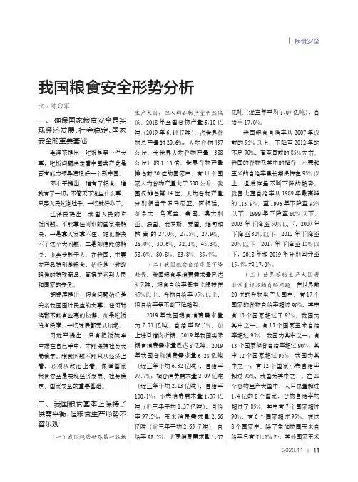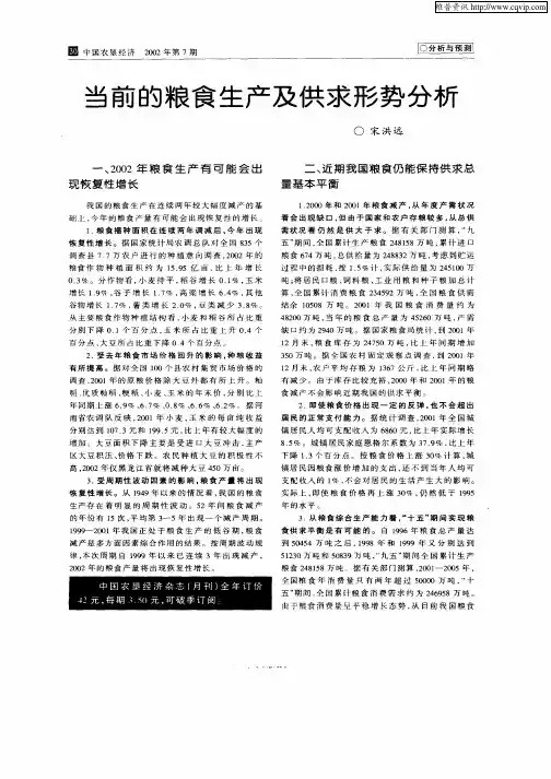 2. 粮食安全形势分析2.1 粮食产量与需求中国是世界上最大的粮食生产和消费国之一。