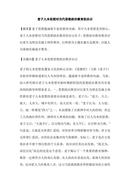 三、老子教育思想的实践1. 顺应自然的教育实践(1)关注学生的个性差异在教育实践中,教师应充分了解学生的个性特点,针对不同学生的需求,制定个性化的教育方案。
