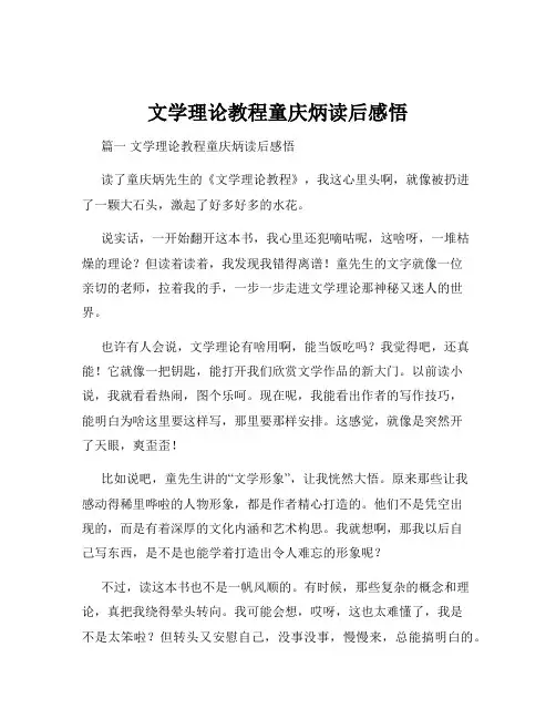 虽然还有很多东西要学,但这一路,真的很值!篇二文学理论教程童庆炳读后感悟哎呀,读完童庆炳的《文学理论教程》,我这心里真是五味杂陈!刚开始读的时候,我觉得自己就像一只无头苍蝇,在那些密密麻麻的文字里乱撞。