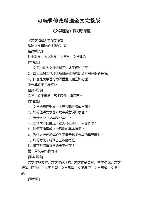 可编辑修改精选全文完整版《文学理论》复习思考题《文学理论》复习思考题绪论文学理论的性质和功能[基本概念]社会科学、人文科学、文艺学、文学理论[思考题]1、文艺学在人文社会科学中处于何种位置?2、谈谈你对文学理论教材的建构原则及本书体例的看法。