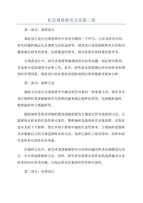 综上所述,社会调查研究方法的第二章主要介绍了调查设计、抽样方法和问卷设计等内容。