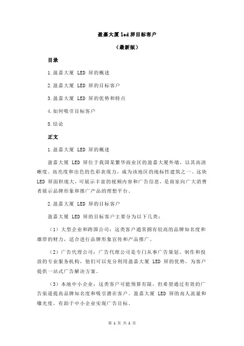 盈嘉大厦LED屏目标客户1. 引言在现代社会中,LED屏幕已经成为商业广告、信息传播和品牌展示的重要工具。