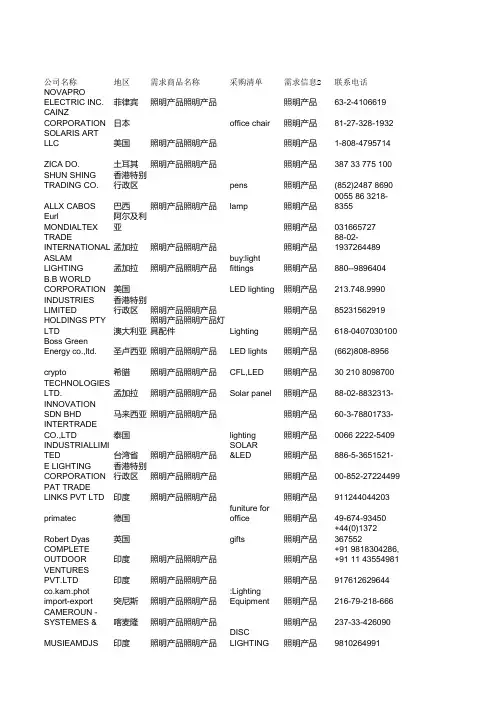 公司名称姓名职务电话深圳市恒创达电路板有限公司彭小忠经理189********深圳百源海科技有限公司周傹凯总经理131********深圳市宏利电子有限公司卢利国经理86 0755 ********深圳市科达嘉电子有限公司唐桂芝电子商务150********深圳市和轩塑胶模具有限公司叶海鉴经理86 0755 ********深圳市新裕华电子科技有限公司王二强经理0086 755 21633400深圳市贝优特科技有限公司梁显洪经理137********深圳市福田区中电信息时代广场美科喇叭经营部谢均平经理136********深圳市欧诺环球电声有限公司杨耀锋经理158********深圳市福田区华强广场柯达江电子经营部陈利萍经理159********深圳市诚恳电子有限公司李友凤经理86 0755 ********深圳市鸿盛业科技有限公司黄开君经理138********赵立和赵立和经理130********深圳市福田区中电信息时代广场金海鑫电子经营部漆永林经理133********深圳市宏达永利科技有限公司龙晔虹经理86 755 86004979深圳市跨越电子有限公司陈曲经理086 0755 ********-830深圳市鸿之泉科技有限公司林金江经理86 0755 ********东莞市平泰电子有限公司杨丰东经理86 0755 ********李珊总经理86-0755-********深圳市铂柯时代投资发展有限公司86-755-29034075深圳市爱美得科技有限公司李广市场部业务经何龙总经理86-0755-********深圳市日益新科技有限公司林利均总经理86-0755-********深圳市艾亿数码科技有限公司蒋勤勇总经理86-0755-********深圳市多维视界电子有限公司深圳市欧昂电子厂 徐鹏总经理86-0755-********-80386-755-82558481-8024张智锋销售部业务经深圳市旋唯电子有限公司张福财总经理86-755-29034200深圳市中科乐电子有限公司邓诗平总经理86-0755-********深圳市必德成科技有限公司86-0755-********-855吴春礼品渠道部主深圳市博亚时代科技有限公司谢忠朋总经理86-0755-********华鹏国际集团有限公司赖云总经理86-0755-********深圳富士莱科技有限公司李玉莹销售部经理86-0755-********深圳市阿尔特兴科技发展有限公司深圳市宏润科技有限公司肖冀业务经理86-0755-********徐益彬销售部经理86-0755-********阿尔科斯科技(深圳)有限公司深圳市正本电子科技有限公司敖文平业务部经理86-755-23804869-807深圳市龙岗区布吉德信电脑经营部吴清焕总经理86-0755-********方显志业务部销售86-0755-********深圳易利电子科技有限公司唐纯良销售部经理86-0755-********深圳市鑫华锋科技有限公司深圳市瑞利嘉电子有限公司黄尚户总经理86-0755-********李迎业务经理86-0755-********深圳市世通兆利科技有限公司王先生销售 qq153886-0755-********-803深圳市比特雅科技有限公司邱亦农美盛特科技有限公司张莉销售部经理8-0755-********-808深圳市利昊科技有限公司深圳市锦泰电子科技有限公司 市场经理086-0755-********新龙腾(香港)发展有限公司熊小姐业务86-0755-********卢艺辉市场总监86-755-33558070深圳洛琪电子有限公司杨燕业务经理0086-0755-********深圳市昊睿科技有限公司潘远洋总经理86-0755-********深圳市佳创科技股份有限公司张小平86-0755-********深圳市集朗科技有限公司谢祖荣总经办86-0755-********深圳市网娱视通科技有限公司深圳科海龙腾科技有限公司谭生销售经理86-0755-*******乔士锋深圳市泓汇科技有限公司吴先生销售086-0755-********-82深圳市华之美半导体有限公司深圳市壹顺科科技有限公司Mia业务员0086-0755-********-804胡福圣业务经理860-755-29706522-822深圳市昊庆发科技有限公司深圳市金美熙科技有限公司廖袁红销售86-0755-********-614付大喜业务经理86-0755-********-8004深圳市迅阳数码科技有限公司王蔚86-755-29607142-831深圳市壹代数码科技有限公司国内业务部深圳市群望科技有限公司 销售经理86-0755-********陈生业务86-0755-********深圳市中恒佳华科技有限公司陈宣华营销专员86-0755-********-8002深圳市博天微电子有限公司李赛涛86-0755-********-847忠成数码深圳分公司深圳市远博尔特科技有限公司黄思晨manager086-0755-********石先生部门经理68-0755-********-8011深圳市博天微电子有限公司吴经理销售部经理86-0755-********深圳市升平乐数字技术有限公司胡志尧业务部86-755-61153535深圳市群索科技有限公司张伟瀚销售部86-0755-********深圳德浦蔡司科技有限公司李敏业务部86-0755-*******-9806华夏数码塑胶电子厂深圳市非常智联科技有限公司周强86-0755-********夏先生销售部86-0755-********深圳市点智伟业科技有限公司夏邦水销售部86-755-61860303-207亚太国际(香港)有限公司深圳市群索科技有限公司彭梦静销售86-0755-********李鸿瑞销售部86-0755-********深圳市利达讯数码科技有限公司郭丽娟深圳市创美佳科技有限公司卫健均业务86-755-23228961衡芯(香港)电子有限公司邓远锋营销中心业务86-0755-********-8060深圳市益光实业有限公司诚兴 游智能工程86-0755-********李海霞深圳市纬信科技有限公司尹铸86-0755-********深圳市国邦兴业电子有限公司校惠网 田书军移动电话地址189********中国 广东 深圳市宝安区深圳市宝安区131********中国 广东 深圳市宝安区大浪街道办沿河路合胜勤工业园3楼整层136********中国 广东 深圳市宝安区沙井镇益华电子城A211(公司地址:东莞虎门北栅仁中岗工业区)150********中国 广东 深圳市龙岗区坂田街道上雪科技城科技二路永创科技园2栋135********中国 广东 深圳市宝安区深圳市沙井后亭岗头工业区一栋135********中国 广东 深圳市宝安区沙井新桥新玉路横岗下工业区蓝天科技园A5栋2楼137********中