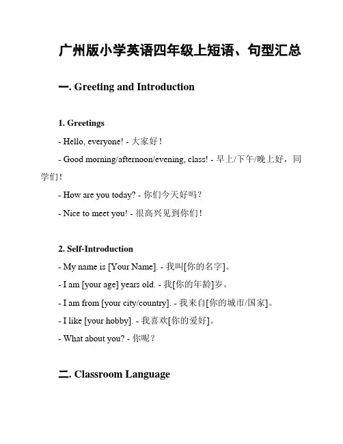 广州版小学英语四年级上短语、句型汇总一. Greeting and Introduction1. Greetings- Hello, everyone! - 大家好!- Good morning/afternoon/evening, class! - 早上/下午/晚上好,同学们!- How are you today? - 你们今天好吗?- Nice to meet you! - 很高兴见到你们!2. Self-Introduction- My name is [Your Name]. - 我叫[你的名字]。