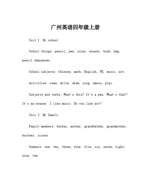 广州英语四年级上册Unit 1: My schoolSchool things: pencil, pen, ruler, eraser, book, bag, pencil sharpener.School subjects: Chinese, math, English, PE, music, art.Activities: read, write, draw, sing, dance, play.Subjects and verbs: What's this? It's a pen. What's that? It's an eraser. I like music. Do you like art?Unit 2: My familyFamily members: father, mother, grandfather, grandmother, brother, sister.Numbers: one, two, three, four, five, six, seven, eight, nine, ten.Colors: red, yellow, blue, green, orange, purple, black, white, pink.Likes and dislikes: I like red. My brother likes blue. My mother doesn't like orange.Unit 3: My friendsPeople: friends, classmates, teacher, principal, librarian, doctor, nurse, police officer, firefighter.Feelings: happy, sad, angry, scared, surprised, tired, excited, bored.Actions: run, jump, skip, hop, walk, swim, dance, sing, talk.Describing friends: She is tall. He is short. She has long hair. He has glasses.Unit 4: My dayTelling time: o'clock, half past, quarter past, quarter to.Daily routines: get up, brush teeth, have breakfast, go to school, have lunch, go home, do homework, have dinner, go to bed.Position words: in, on, under, behind, in front of, between, next to, near.Describing actions: I get up at seven o'clock. I have breakfast at eight o'clock. I go to bed at nine o'clock.。