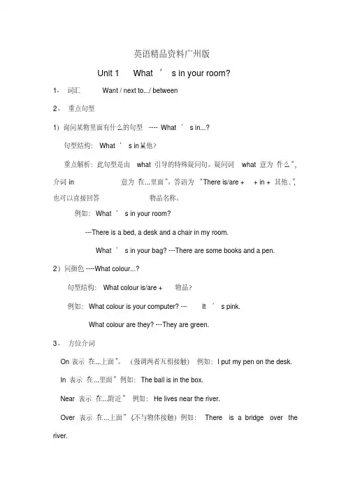 英语精品资料广州版Unit 1 What’s in your room?1、词汇Want / next to.../ between2、重点句型1)询问某物里面有什么的句型----What’s in...?句型结构:What’s in + 其他?重点解析:此句型是由what引导的特殊疑问句。