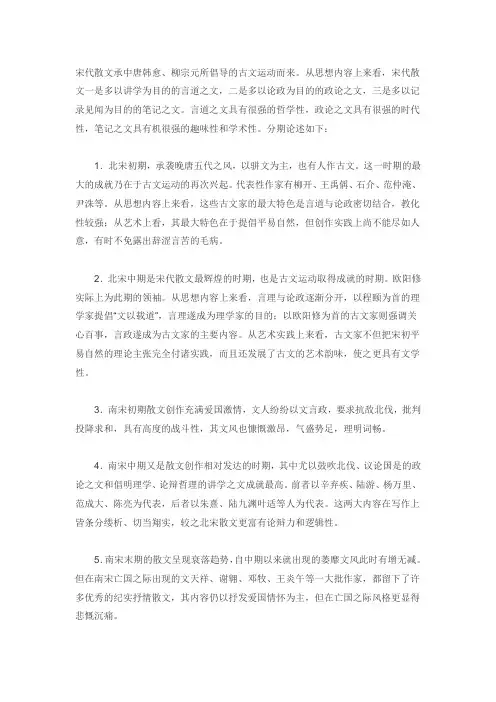三、宋代文学的发展分期与历史地位第一章欧阳修与北宋诗文革新第一节:宋初文坛北宋开国不久,就有柳开等人提出文学复古理论,反对晚唐五代浮靡文风,但当时的诗文创作,主要还是沿袭晚唐五代风格,只少数作家如王禹偁、杨亿等人的创作呈现了一些新的因素。