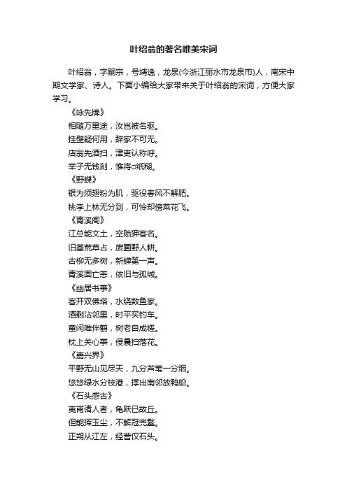 叶绍翁的著名唯美宋词叶绍翁,字嗣宗,号靖逸,龙泉(今浙江丽水市龙泉市)人,南宋中期文学家、诗人。
