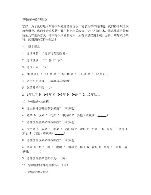 感谢您的支持与配合!一、基本信息1. 您的姓名:(请填写真实姓名)2. 您的性别:(□ 男□ 女)3. 您的年龄:()A. 20岁以下B. 20-30岁C. 31-40岁D. 41-50岁E. 50岁以上4. 您所在的地区:(请填写具体地区)5. 您的种植年限:()A. 1年以下B. 1-3年C. 3-5年D. 5-10年E. 10年以上二、种植品种及面积6. 您主要种植哪些春季果蔬?(可多选)A. 蔬菜B. 水果C. 花卉D. 中药材E. 其他(请说明:______)7. 您种植的蔬菜品种有哪些?(可多选)A. 大白菜B. 菠菜C. 油菜D. 西红柿E. 黄瓜F. 白萝卜G. 蒜苔H. 豆角I. 茄子J. 其他(请说明:______)8. 您种植的水果品种有哪些?(可多选)A. 苹果B. 梨C. 桃D. 樱桃E. 葡萄F. 柿子G. 香蕉H. 草莓I. 其他(请说明:______)9. 您种植的蔬菜总面积为:(亩)10. 您种植的水果总面积为:(亩)三、种植技术及投入11. 您在种植过程中,主要采用哪些种植技术?(可多选)A. 传统种植B. 生物防治C. 节水灌溉D. 保护地栽培E. 品种改良F. 其他(请说明:______)12. 您在种植过程中,主要投入哪些成本?(可多选)A. 种子、种苗B. 农药、化肥C. 人工费D. 设施建设E. 机械设备F. 其他(请说明:______)13. 您认为目前种植过程中,哪些技术或投入较为重要?(请排序)A. 种子、种苗B. 农药、化肥C. 人工费D. 设施建设E. 机械设备F. 其他(请说明:______)四、市场及销售14. 您的果蔬主要销售渠道有哪些?(可多选)A. 农贸市场B. 零售店C. 超市D. 电商平台E. 外销F. 其他(请说明:______)15. 您认为目前销售过程中,哪些渠道较为重要?(请排序)A. 农贸市场B. 零售店C. 超市D. 电商平台E. 外销F. 其他(请说明:______)16. 您在销售过程中,遇到的主要问题有哪些?(可多选)A. 市场竞争激烈B. 产品质量不稳定C. 价格波动大D. 销售渠道单一E. 其他(请说明:______)五、政策及建议17. 您认为政府在春季果蔬种植方面,有哪些政策支持或改进空间?(请说明:______)18. 您对春季果蔬种植有哪些建议?(请说明:______)感谢您抽出宝贵时间填写此问卷,祝您种植顺利,生活愉快![调查单位名称][。